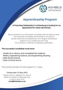 A Franchise Dealership in Lichtenburg is looking for an Apprentice for motor technician.