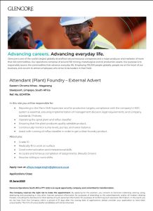 Apply now at: alloys.magarenghr@glencore.co.za Applications Close: 01 June 2023 Glencore