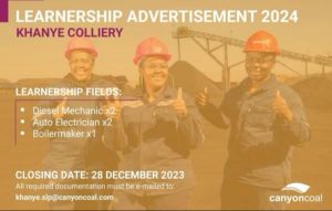 KHANYE COLLIERY engineering Learnership Posted on December 20, 2023 By Recent Jobs KHANYE COLLIERY Learnership LEARNERSHIP FIELDS: • desiel Mechanic x2 • “Auto Electrician x2 • Boilermaker xl CLOSING DATE: 28 DECEMBER 2023 All requested documentation must be e-mailed to: khanye.slp@canyoncoal.com