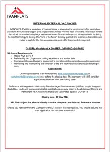 This unique mineral deposit will be exploited using large mechanised state-of-the-art underground mining methods, deploying the latest technology to develop this ‘mine of the future”. Suitably qualified and experienced candidates are invited to apply for the following vacancies required for the project development.