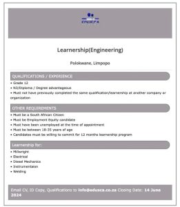 • Must not have previously completed the same qualification/learnership at another company or organization