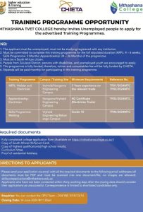 TRAINING PROGRAMME OPPORTUNITY MTHASHANA TVET COLLEGE hereby invites Unemployed people to apply for the advertised Training Programmes.
