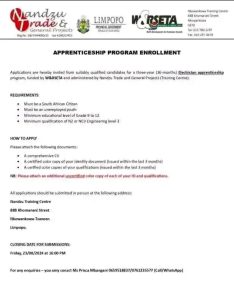 Applicants are hereby invited from suitably qualified candidates for a three year (36-months) Electrician apprenticeship program, funded by W&RSETA and administered by Nandzu Trade and General Projects (Training Centre).