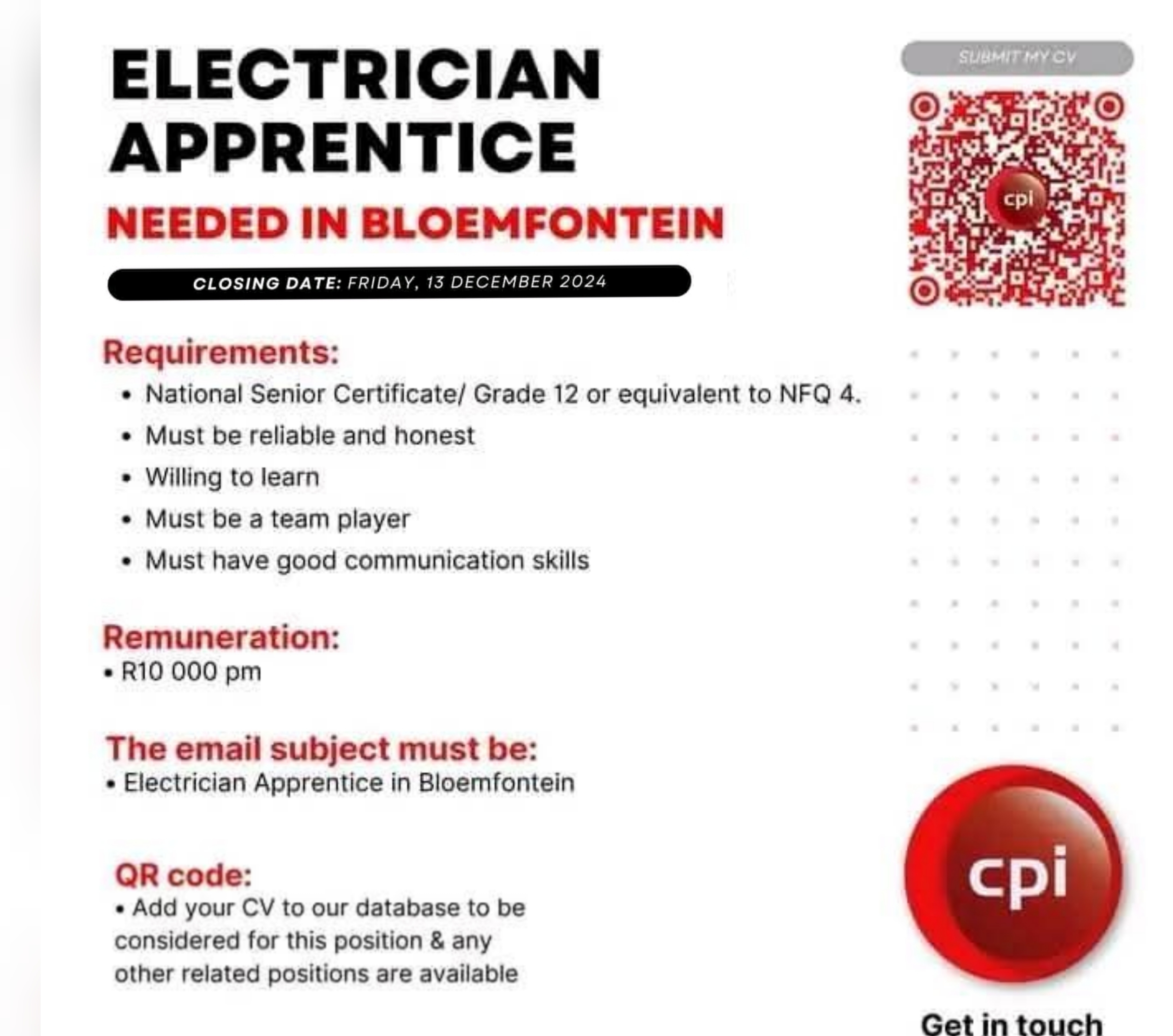ELECTRICIAN APPRENTICE NEEDED IN BLOEMFONTEIN