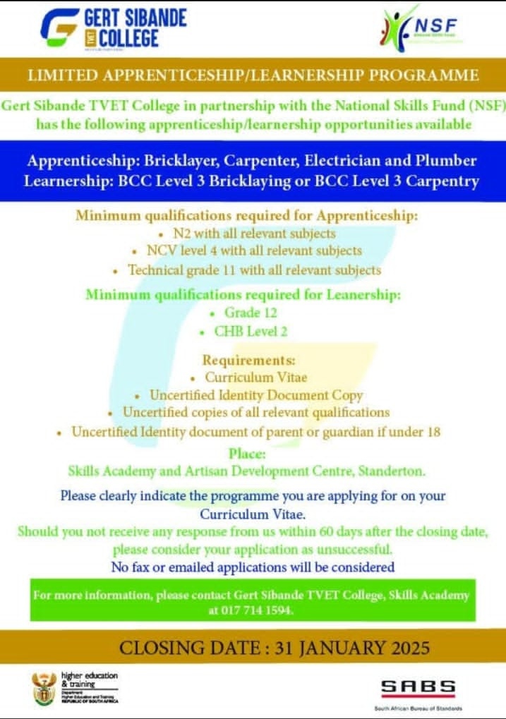 Are you ready to start your career as an artisan? Gert Sibande TVET College, in partnership with Skills Academy and the Artisan Development Centre, offers limited apprenticeship opportunities in collaboration with merSETA. These exciting apprenticeship programs are a gateway to hands-on training and experience in fields.