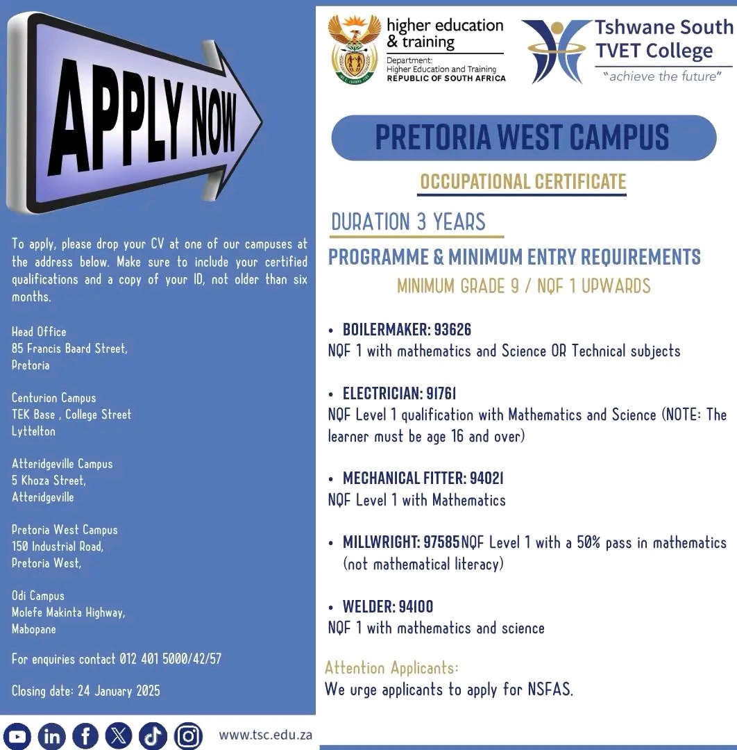 • BOILERMAKER: 93626 NQF 1 with mathematics and Science OP Technical subjects