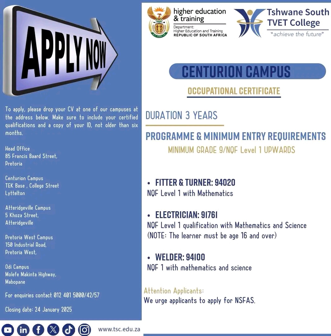 • ELECTRICIAN: 91761 NQF Level 1 qualification with Mathematics and Science (NOTE: The learner must be age 16 and over)