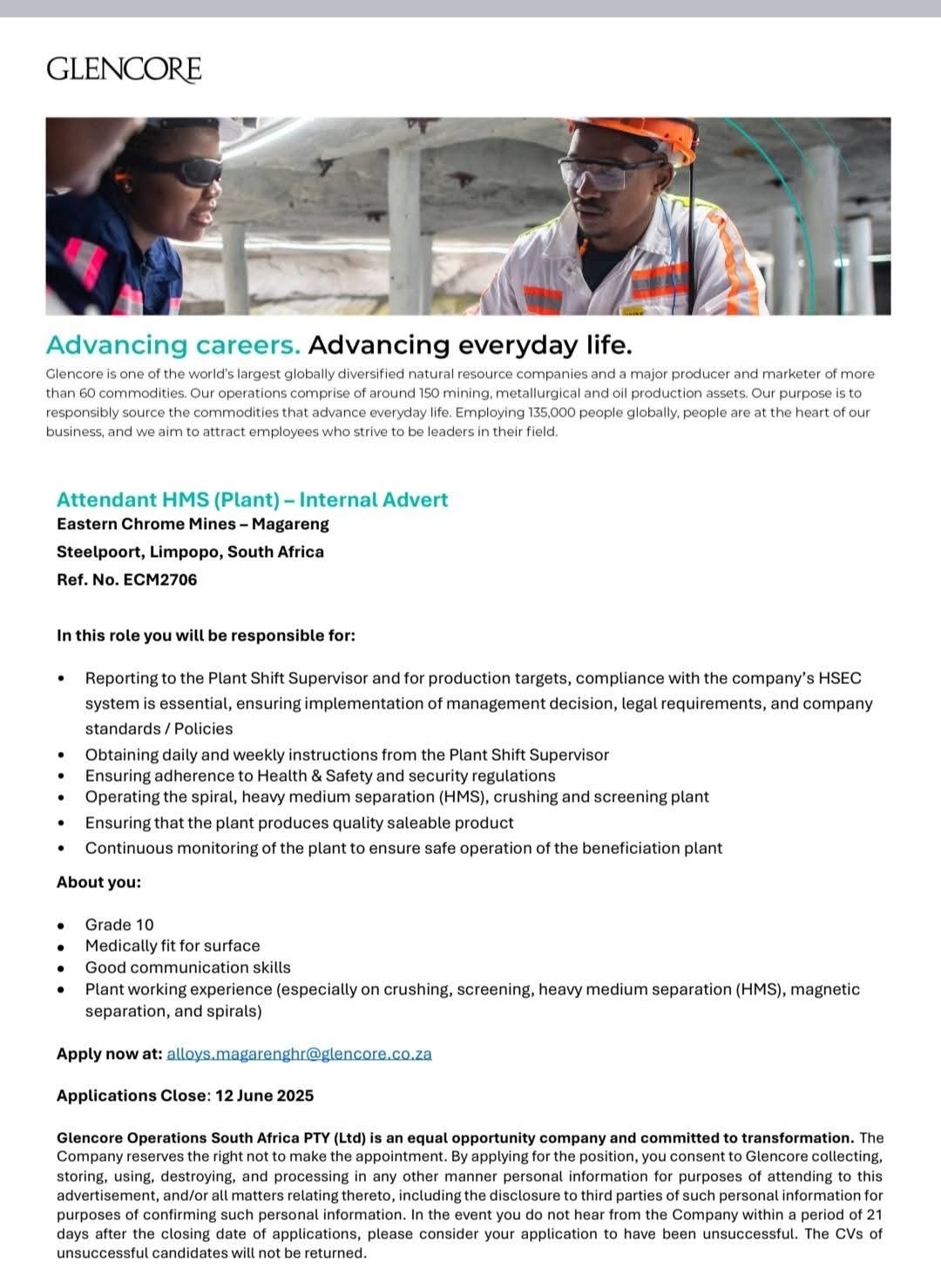 Glencore Operations South Africa PTY (Ltd) is an equal opportunity company and committed to transformation. The Company reserves the right not to make the appointment. By applying for the position, you consent to Glencore collecting, storing, using, destroying, and processing in any other manner personal information for purposes of attending to this advertisement, and/or all matters relating thereto, including the disclosure to third parties of such personal information for purposes of confirming such personal information. In the event you do not hear from the Company within a period of 21 days after the closing date of applications, please consider your application to have been unsuccessful. The CVs of unsuccessful candidates will not be returned.
