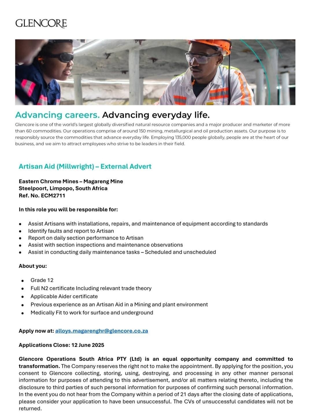 Glencore invite candidate to apply for millwright and diesel mechanical aid
