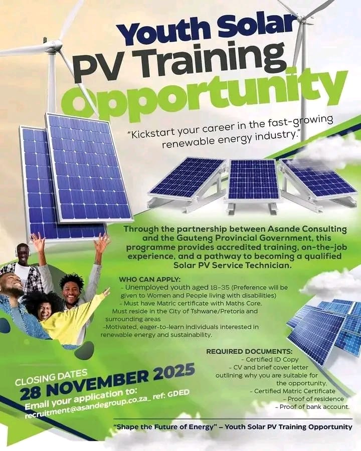 Through a partnership between Asande Consulting and the Gauteng Provincial Government, youth will receive accredited training + on-the-job experience leading to a pathway as a qualified Solar PV Service Technician.